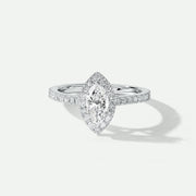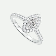 Our Astra lab grown diamond ring is set with a gorgeous marquise cut diamond centre stone, framed by a glittering halo and pavé set diamond shoulders. Beautifully crafted in 18 carat white gold, this gorgeous ring design is set with a total of 1ct of sparkling lab grown diamonds. The 0.65ct G VS2 marquise cut centre stone is IGI certificated and comes with a full diamond certificate.