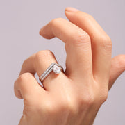 Our Mayu ring is elegantly crafted in 9 carat white gold and set with shimmering pavé lab grown diamonds that flow halfway down this band, creating a deeply curved chevron shape. This stylish ring is perfect on its own or paired with one of our engagement rings.