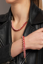 Make a bold statement with this vibrant gold tone hot pink bracelet. Designed to stand out, this piece features a stunning fusion of textures and materials, seamlessly combining elegance and modern design. Perfect for adding a pop of colour to any outfit, whether casual or dressy.
