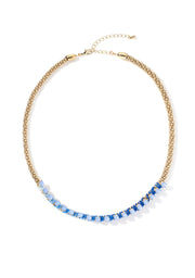 Inspired by the mesmerizing hues, this piece features a unique blend of deep blue fabric, lustrous stones, and gleaming gold-tone detailing. This eye-catching accessory adds a hint of luxury and artistic charm to any ensemble.