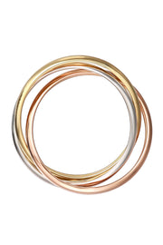 Three interlocking bands of rose, white, and yellow 9 carat gold. The three bands symbolize the past, present, and future of the couple.