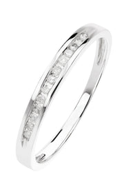 An elegant 9 carat white gold half eternity ring embellished with 0.10ct of channel set sparkling, white diamonds